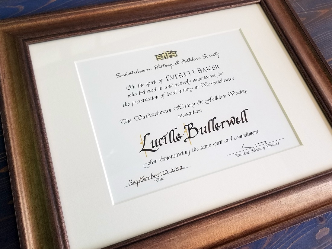 On Saturday, September 10, the Saskatchewan History and Folklore Society (SHFS) recognized Lucille Bullerwell’s longtime commitment to the Clayton McLain Memorial Museum by awarding her the 2022 Everett Baker Award for Saskatchewan Heritage.