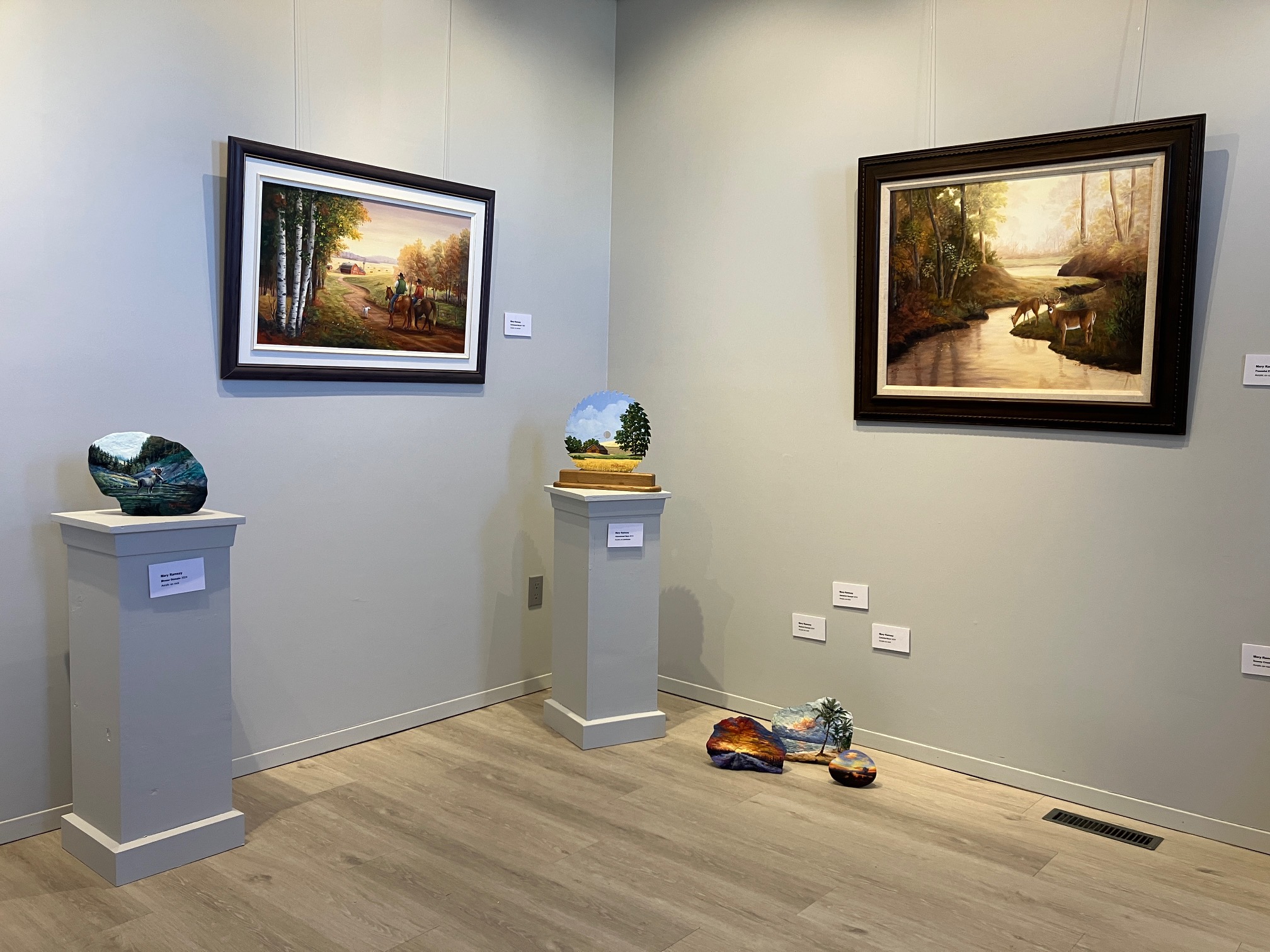 The Spare Room Gallery launched its visual arts exhibition space with life-long area resident Mary Ramsay’s “Landscape and Sky”. The pastoral beauty of the rural countryside is explored in acrylics on a variety of materials including canvas, rocks, and sawblades.