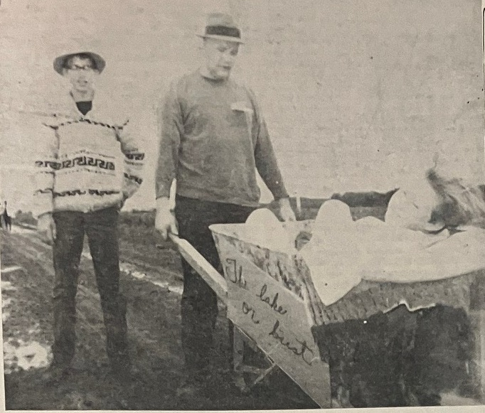 In the face of an early morning downpour, muddy roads and threatening skies, 47 participants turned out to compete in the walkathon from Cut Knife to Atton’s Lake, a distance of 13 miles on July 6. The proceeds will initiate a fund to move the Ovenstown School from Cloan to Cut Knife.